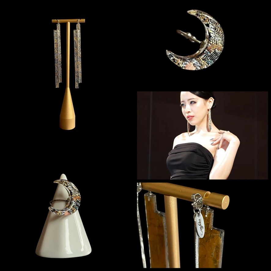 「今回このジュエリーをつけてショーを歩かせて頂いた望月よるです。初めて手に取った時感覚今でも忘れられません。重厚感、高級感 そして一つ一つ手で作られてるという繊細なデザインに一目で魅了されました。身につけた時に私自身の内側から魅力を引き出してくれるような、心強い、勇気をくれる魔法のジュエリーで、やはり人の手で 丁寧に作られたものというのは造り手の思いが伝わってくるんだなぁ。と すごく感動させられました。このジュエリーと共にショーを歩かせていただいたこと とても光栄に思います。是非、この感動を皆さんにも手に取って、肌で感じて欲しいです。」