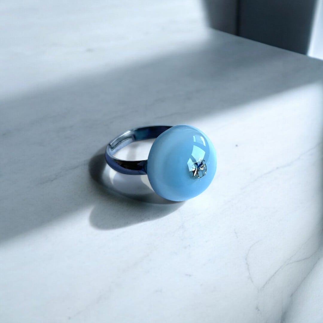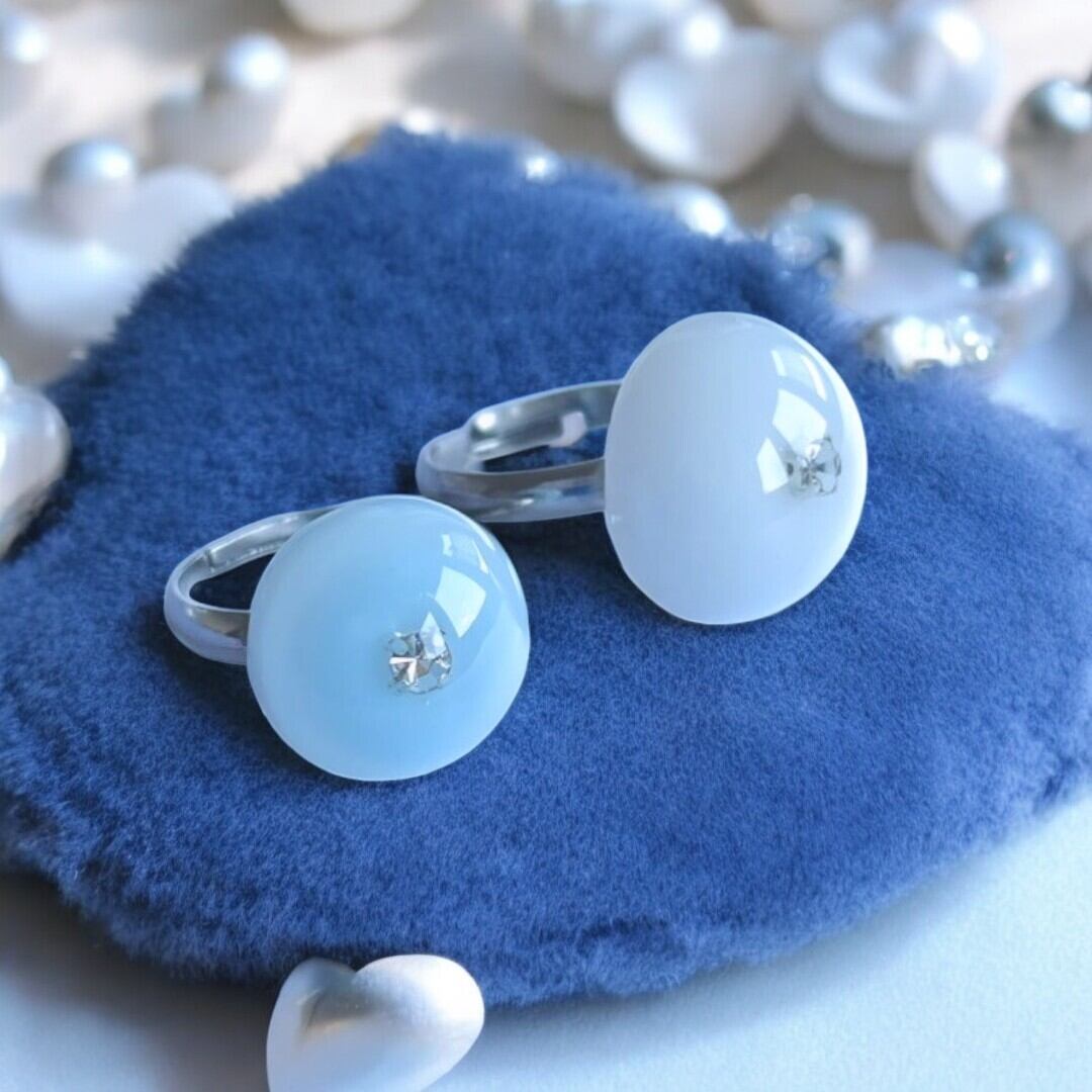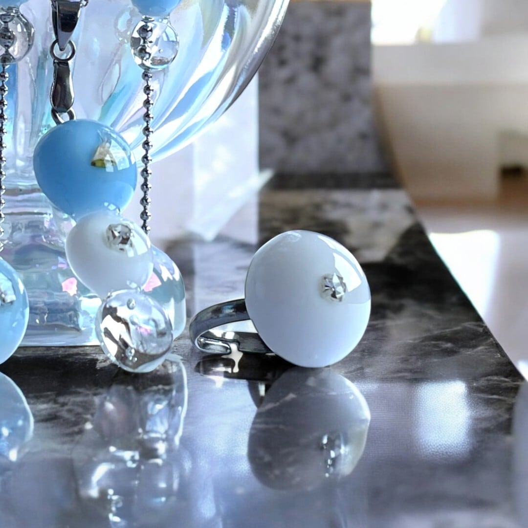 柔らかな水色と清らかな白が絶妙に組み合わさったデザインは、どんなスタイルにも華やかさを添え、指先を美しく彩ります。このリングは、春夏のコーディネートにぴったりのアイテムです。
