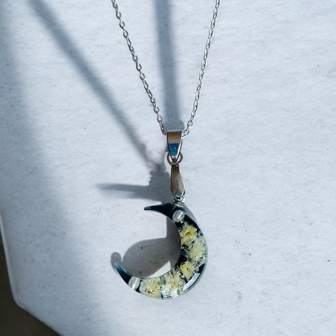 透明感のあるブラックベースに咲く、繊細なドライフラワーと小さな星の粒。まるで夜風に揺れる幻想的な月のしずくのよう。