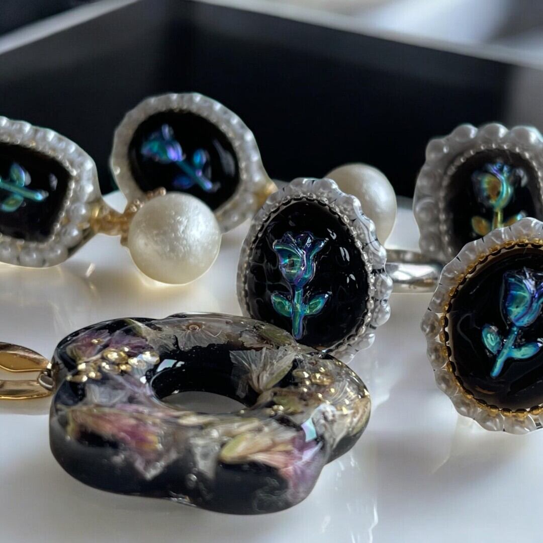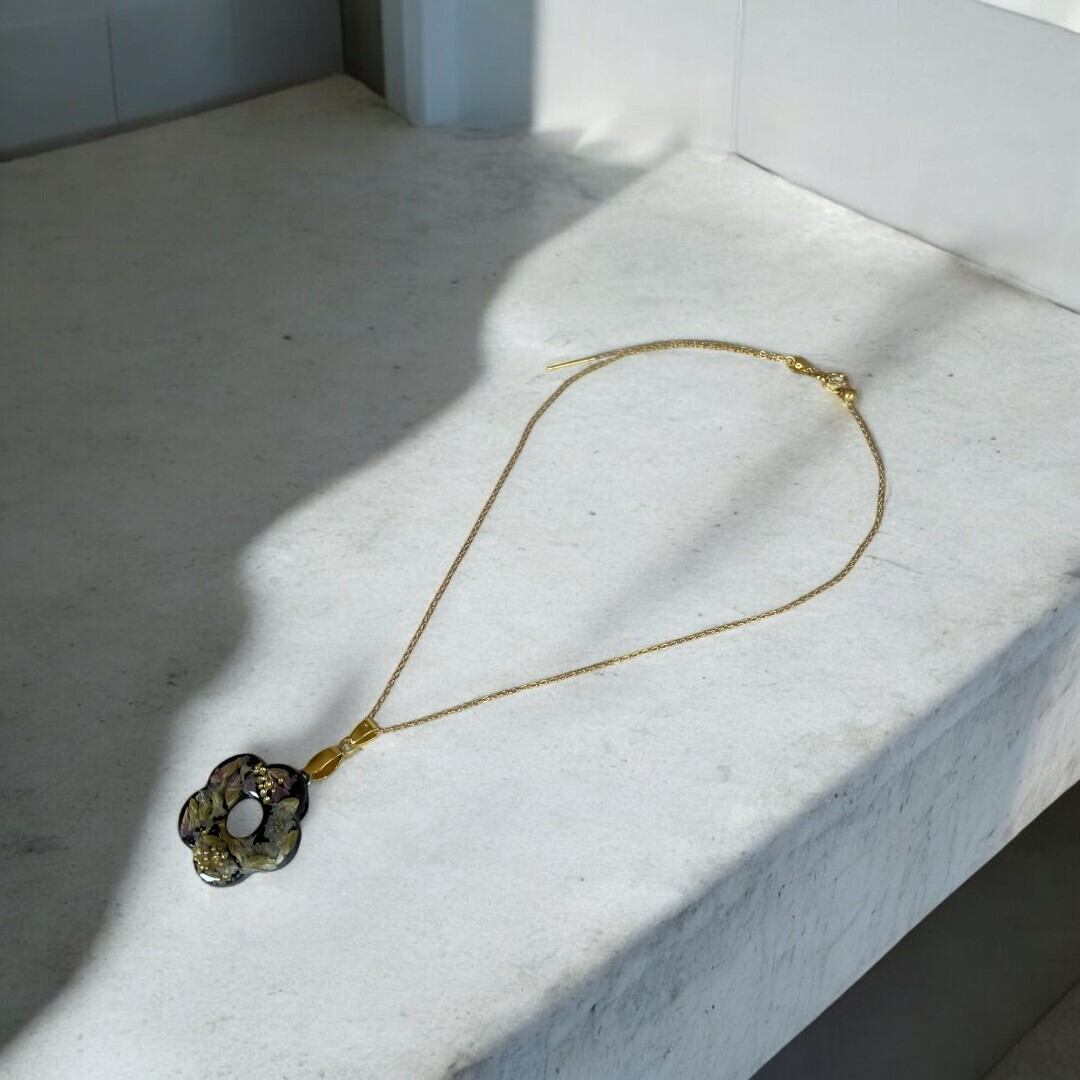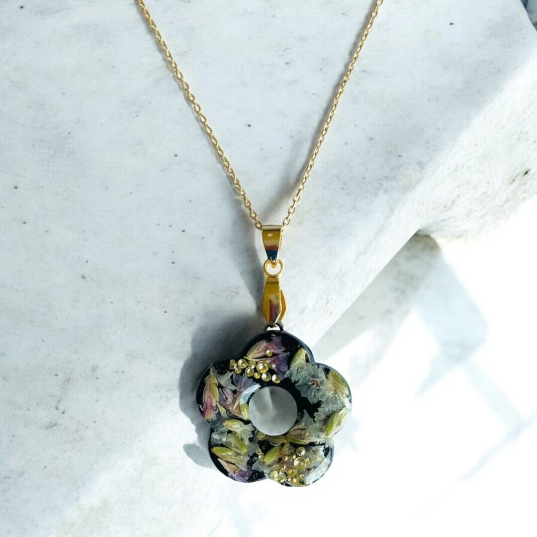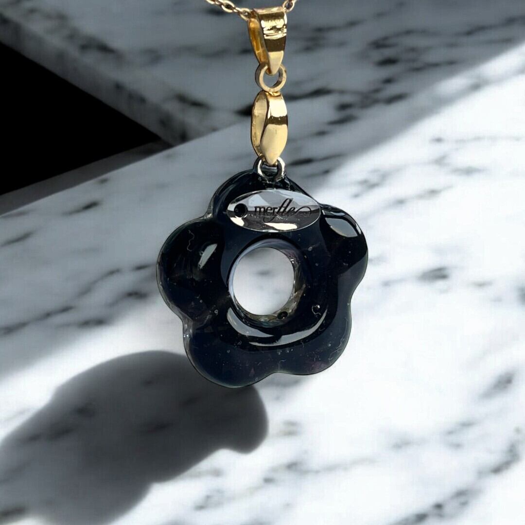 艶のある黒のレジン樹脂に、色とりどりのドライフラワーをたっぷりと閉じ込めた、merfleオリジナルの贅沢なペンダントトップ。