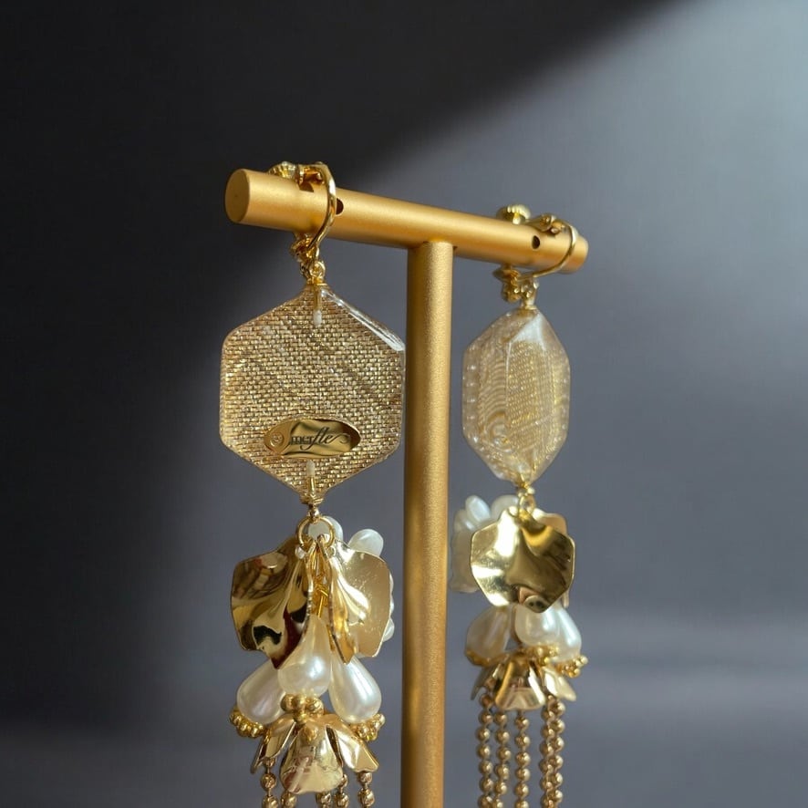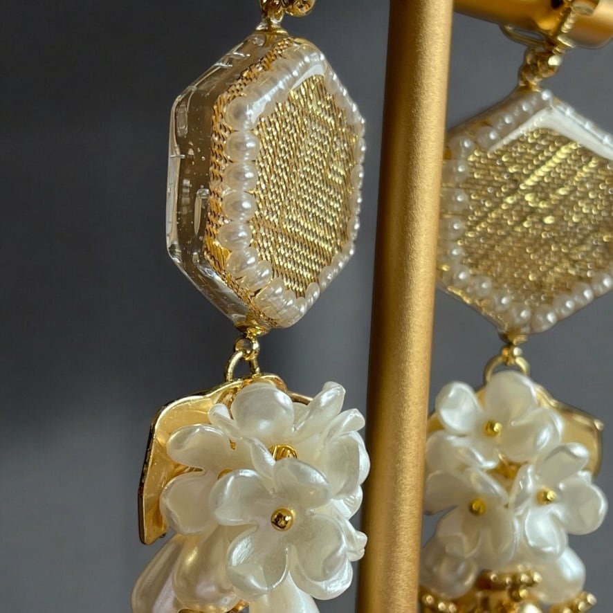 着物の帯を加工して仕上げたパーツはまるで宝石のようです。
